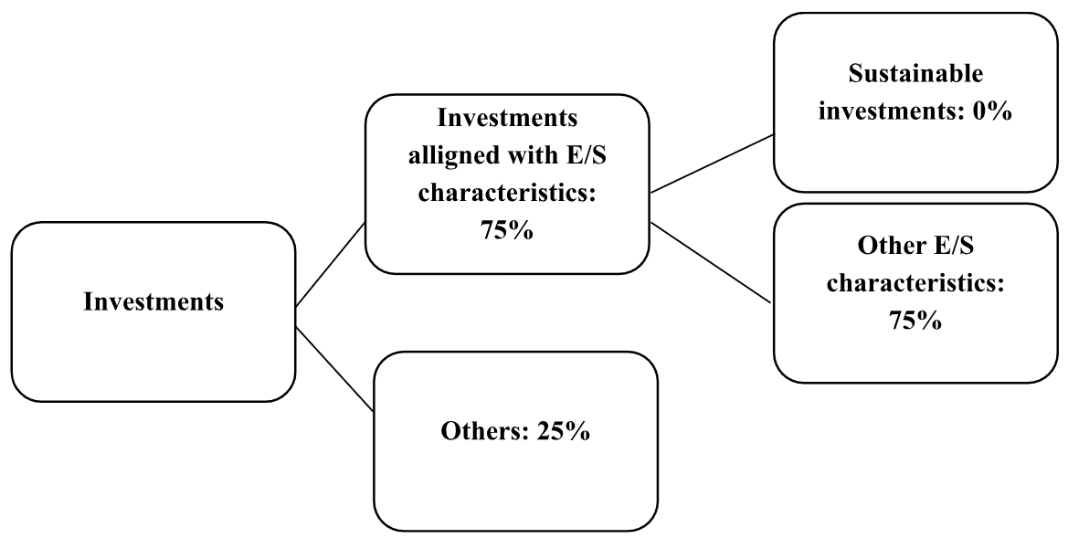 The Fund will always maintain 75% of its assets in “Investments aligned with environmental and social characteristics” (“Other environmental and social characteristics”). This category may include shares, bonds, UCITS traded as ETFs, and money market instruments. The “Other” category, representing a maximum of 25% of total Fund assets, may include financial instruments without an ESG score such as cash, shares, bonds, UCITS traded as ETFs, money market instruments, or other financial instruments permitted by law.